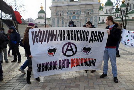Хотя для большинства постсоветских людей 8 марта сводится к шоколадно-тюльпанной эйфории, все-таки изначально этот праздник был политическим. Так повелось со времен Клары Цеткин и девушки с веслом и об этом, последнее время в Киеве вспоминают. По крайней мере, загадочная организация левых феминисток под названием «Феміністична Офензива» вспоминает точно. Это оригинальная полит-тусовка, к которой кроме вышеупомянутых примыкают несколько в основном молодежных и радикальных организаций. («Ритми Спротиву»; «Студентська профспілка» «Пряма дія»; «Автономна Спілка Трудящих»; «Лібертарна Координація»; «Ліва Опозиція»; «Інсайт»). Их неизменным фирменным стилем является сочетание подчеркнуто европейского имиджа, анимешного дресс-кода, и радикального сленга в стиле агитбригад 20х годов. Каждый год 8 марта они проводят традиционный марш похожий на флеш-моб с танцами, барабанами и обязательным проходом мимо памятника княгине Ольги, которую левые феминистки традиционно… не любят, за эксплуатацию трудового народа. В этом году они снова вышли под лозунгами: «Свобода! Равенство! Глобальная солидарность!», «Реформы не женское дело, женское дело – революция!», «Традиция – не данность! Наш выход — солидарность!»