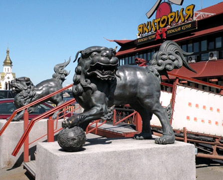 Довольно известные до недавно набережные звери. Вообще, за последние годы, в Киеве расплодилась в большом количестве различная экзотическая живность – львы, драконы и прочая непривычная фауна. При том ее количественное прибавление пропорционально росту восточных же ресторанов. Ну, Восток, как известно дело тонкое, японцы, например, всегда отличались скромностью, хотя суши баров по Киеву не в пример больше, но их при нынешней повальной моде на минимализм, не сразу и найдешь. Зато китайский ресторан! С иероглифами, веерами, тяжеловатой позолотой, фонариками и другим декором пропустить трудно… Японцам, в конце – концов, надоела собственная скромность, и они решили, что их самурайскому краю тоже есть чем гордиться, по крайней мере, похожему на древний замок плавучему ресторану «Якитория». Ну и, естественно в замке и «стражи», это такие зверюшки на входе, мистические – традиционные – отпугивают злых духов, привлекают посетителей – два в одном!